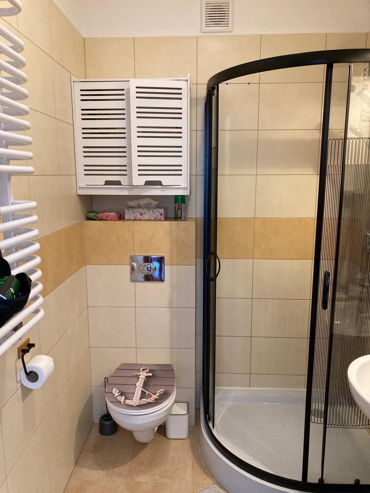 - 🚿 Łazienka – kabina prysznicowa, pralka